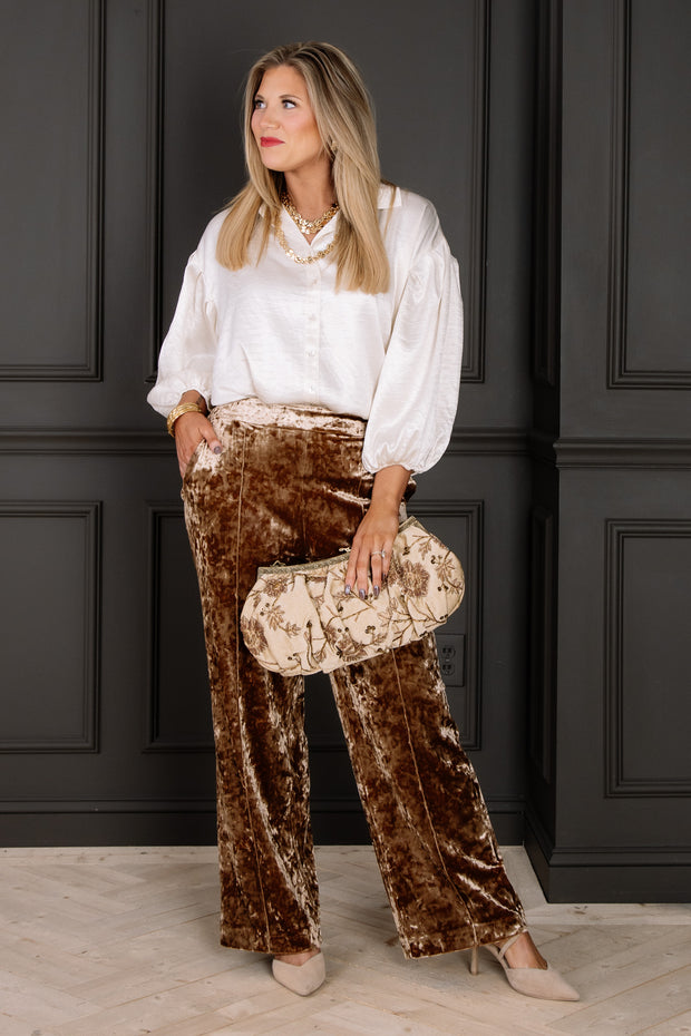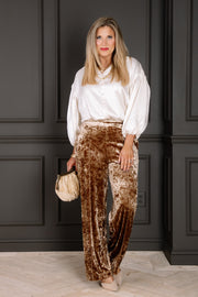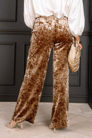 Luxe crushed velvet wide-leg pants with an elastic pull-on waistband for effortless comfort. Functional side pockets and a flattering silhouette make these a versatile wardrobe essential.
