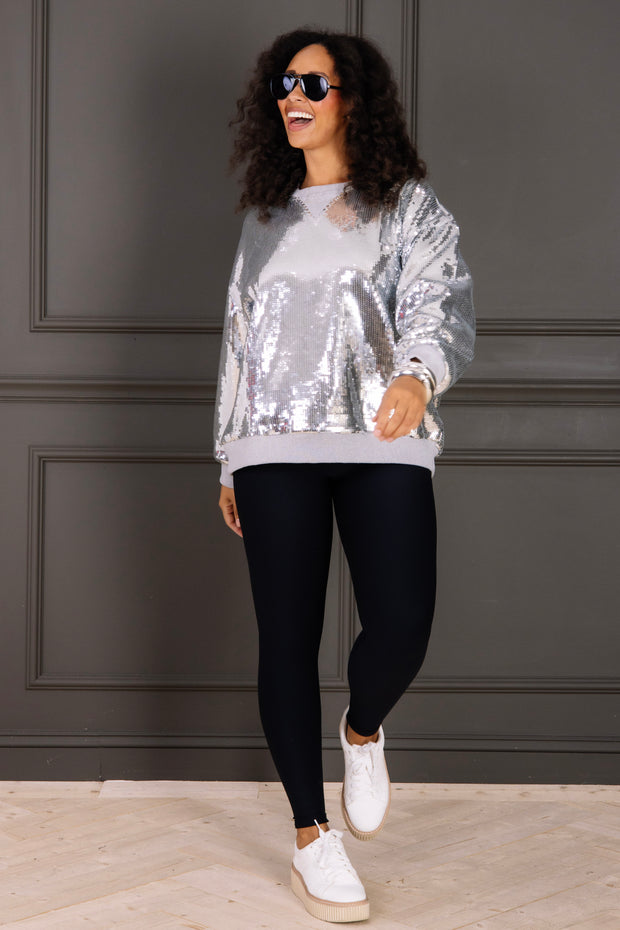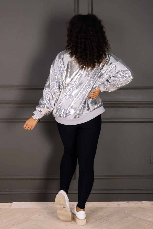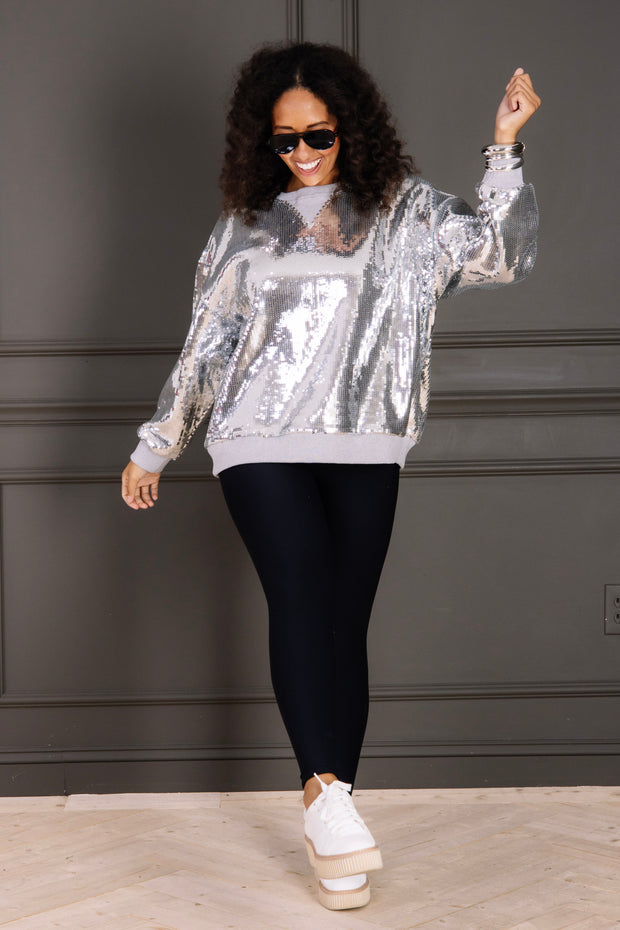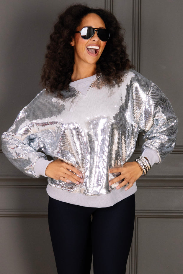 Dazzle in this silver sequin sweatshirt featuring a rounded neckline and long sleeves. Perfect waist-length cut catches light with every move.
