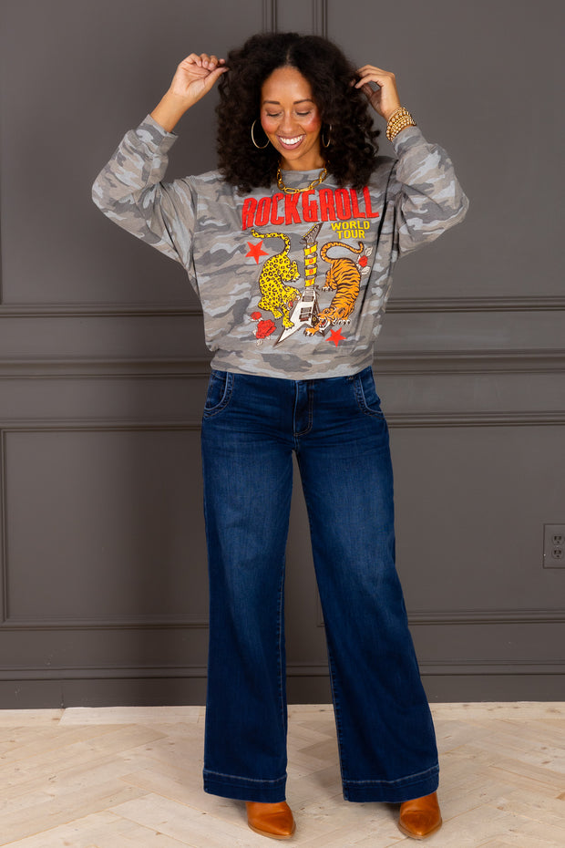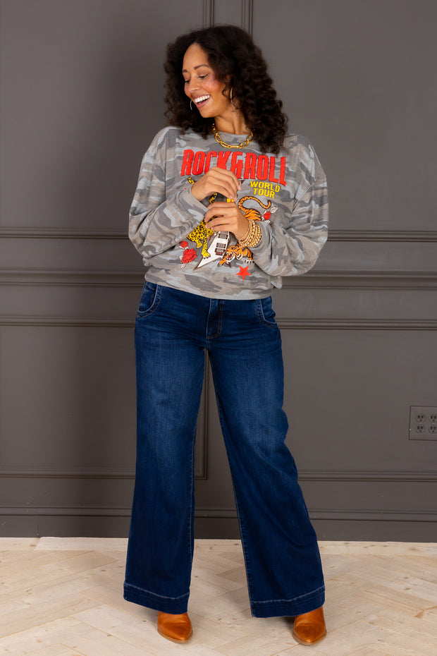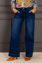 The Meg High Rise Oversize Wide Leg Jean features a flattering dark wash with front zip button closure and functional side pockets. Its relaxed wide leg silhouette offers effortless style and comfort for everyday wear.