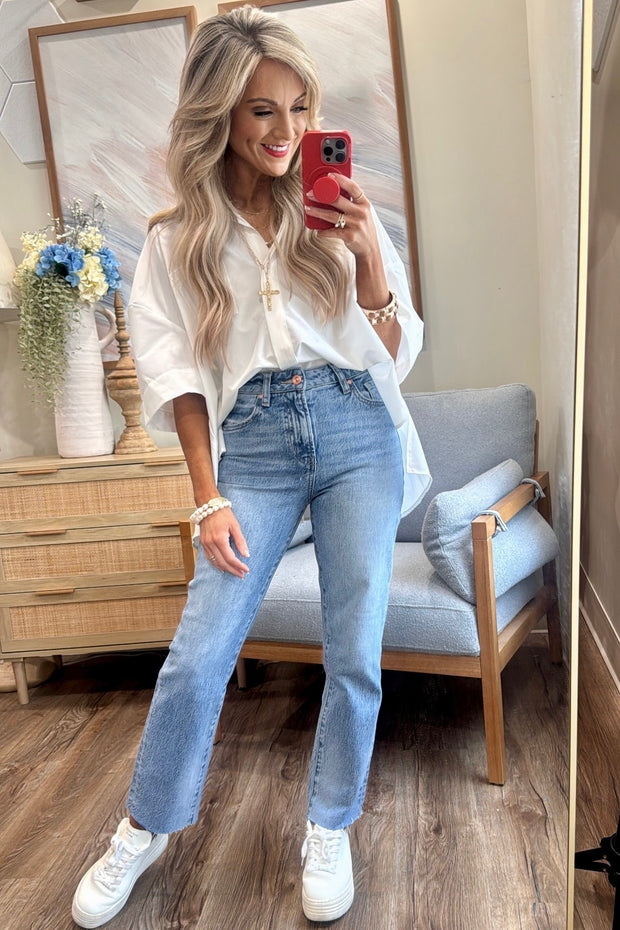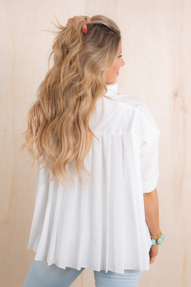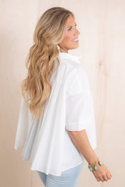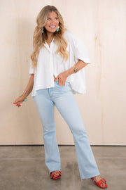 Elevate your wardrobe with our Erin White Short Sleeve Blouse, featuring a sophisticated top collar and convenient button-down front. The waist-length cut creates a flattering silhouette that pairs perfectly with high-waisted bottoms for a polished look.