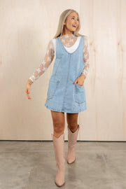 This denim overall dress features an adjustable round neckline and straps, along with a convenient front pocket. Made from breathable and comfortable material, it is the perfect choice for a cute and stylish summer outfit. Enjoy the versatility and comfort of this must-have dress.