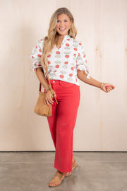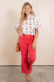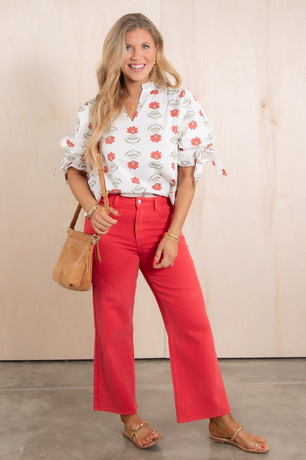 Designed with a flattering v-neckline and charming ruffled collar, this waist-length top features tie short sleeves for a touch of flair. Its delicate floral print adds a charming touch to any outfit.