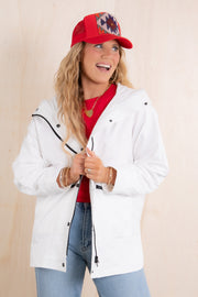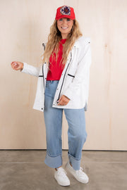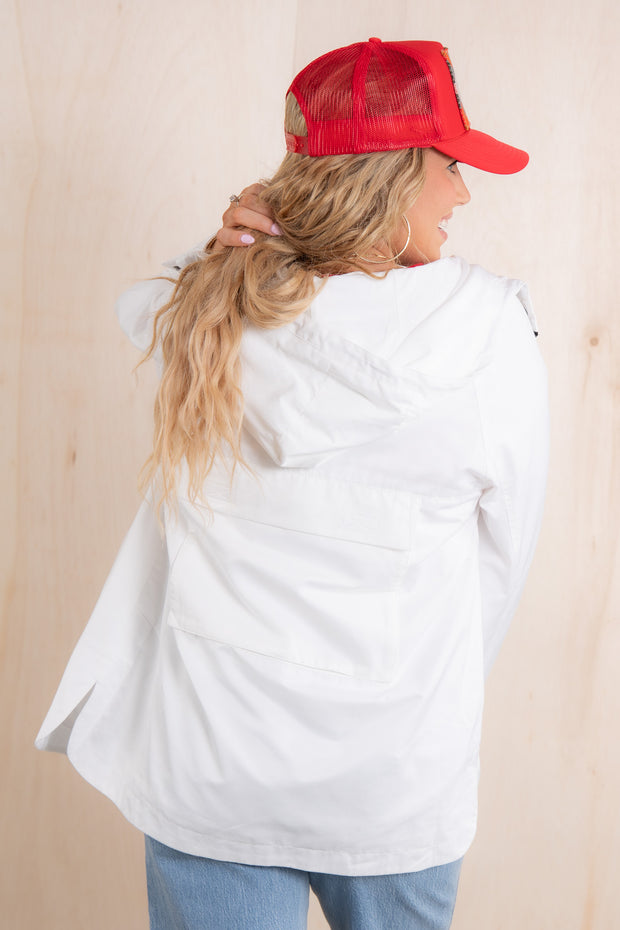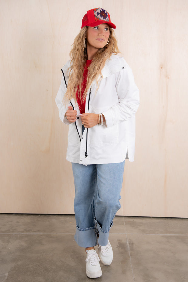 Features include a practical hood, long sleeves, and convenient front pockets. The full-length zipper makes it easy to put on, while the longer length provides extra coverage during rainy days.