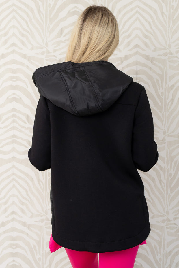 Sleek black quilted jacket featuring a comfortable waist-length cut with long sleeves and a convenient front zip. The distinctive hooded back adds modern style and extra coverage for unpredictable weather.