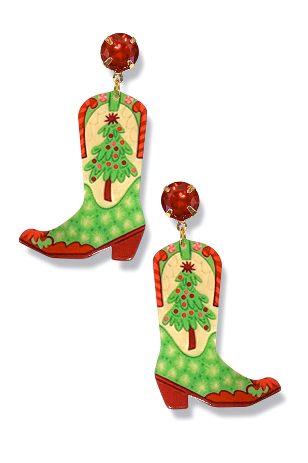 Celebrate the holiday season with these earrings. Featuring festive tree prints on boot-shaped earrings, they add a charming western touch to your holiday outfit.