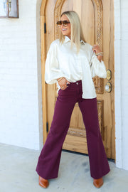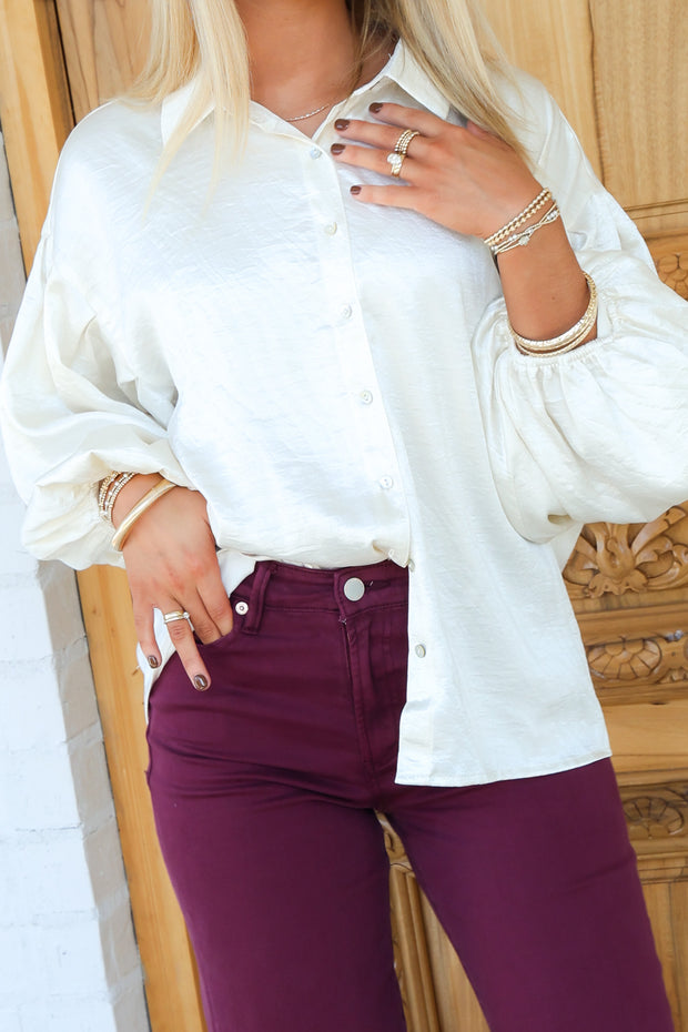 This ivory long sleeve top features puffed sleeves with button cuffs, a button-down front, and a classic collar. It combines elegant details with a comfortable fit for a stylish look.