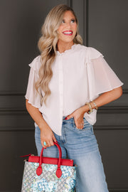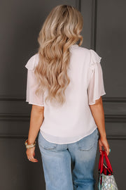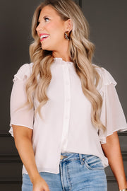 This blouse features a rounded neckline and ruffled short sleeves for a soft, feminine look. Its waist-length cut and button-down front offer a flattering, easy-to-wear style. The inner lining ensures comfortable wear throughout the day.