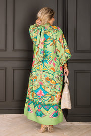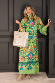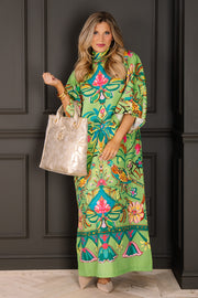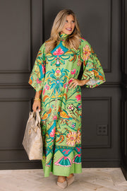 Green caftan maxi dress with half sleeves and high neckline that ties at front or back for versatile styling. Features a captivating abstract bird print in multicolor tones. Flowing silhouette offers effortless comfort and bohemian charm.
