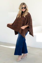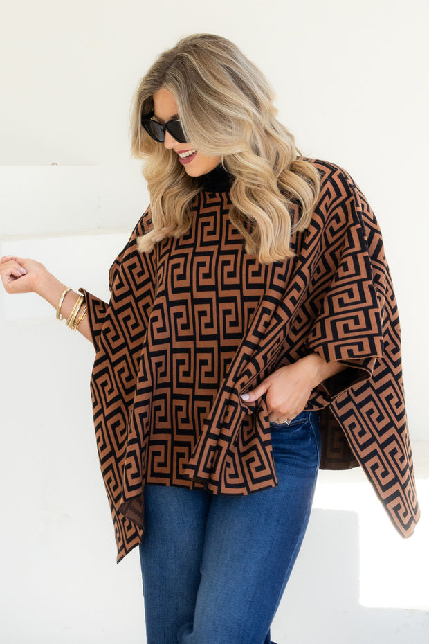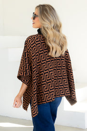 This Cape features a comfortable oversized fit with a stylish turtleneck and short sleeves. Its unique cape detailing adds an elegant touch, while the abstract print offers a modern, artistic look. Perfect for layering or wearing on its own for a standout outfit.