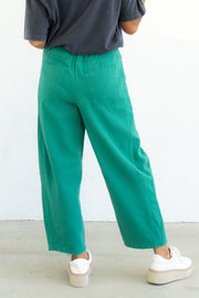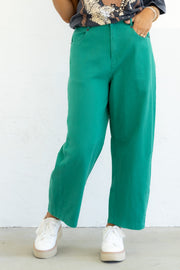 The Help Myself Green Barrel Pant features a high-rise fit with a zip and button closure. It includes front and back pockets and an elastic waistband in the back for added comfort.
