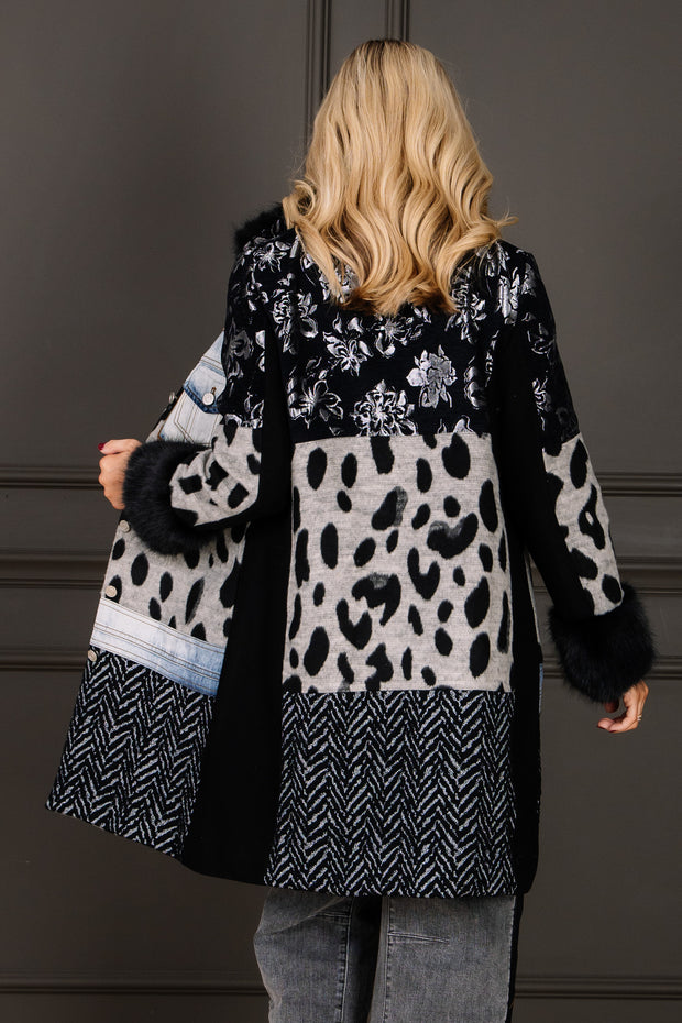 Make a bold statement in this black multi-print jacket featuring leopard and floral designs on denim. Luxe faux fur trim adds glamorous edge and texture. A standout piece that transforms any outfit into something unforgettable.