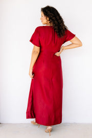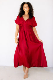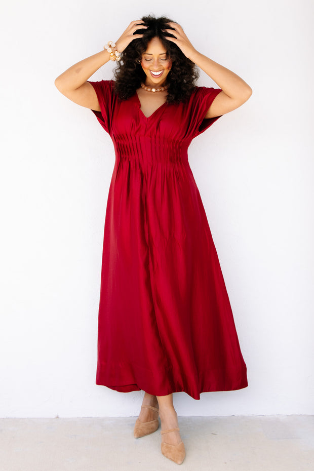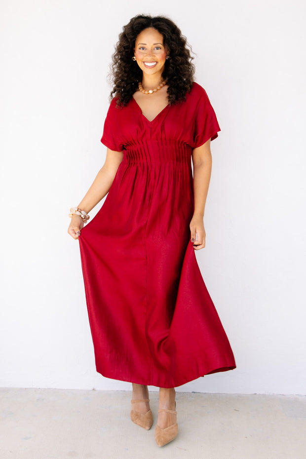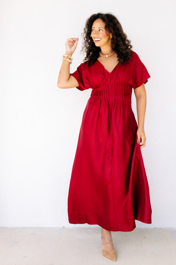 Effortlessly elegant and comfortable, this Maxi Dress features a flattering v-neckline, short sleeves and a flowy maxi length. Made with luxurious satin material and delicate pleated detailing, this dress is perfect for any occasion.