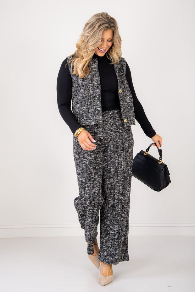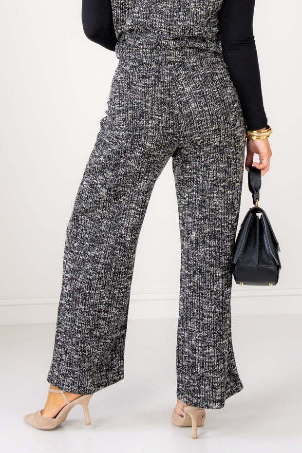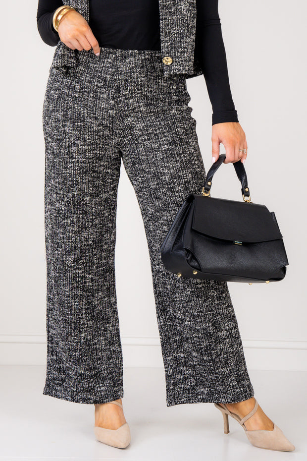 The Out of Office Black Wide Leg Pant offers a classy and sophisticated look with its black and white tweed-like fabric. Featuring an elastic pull-on waistband, these pants provide both comfort and style for any occasion.