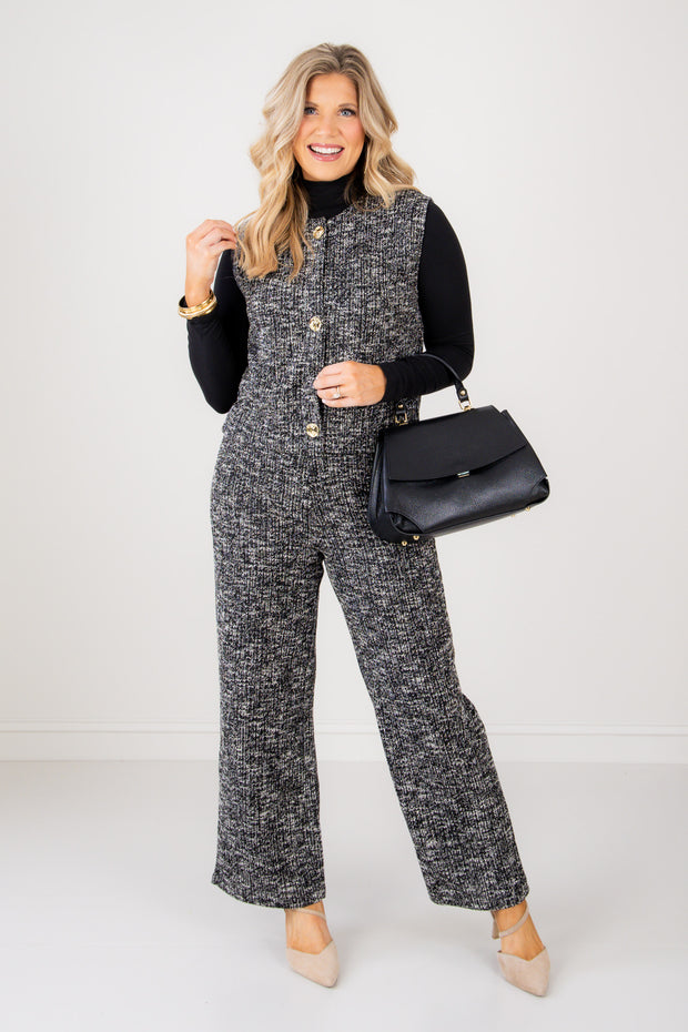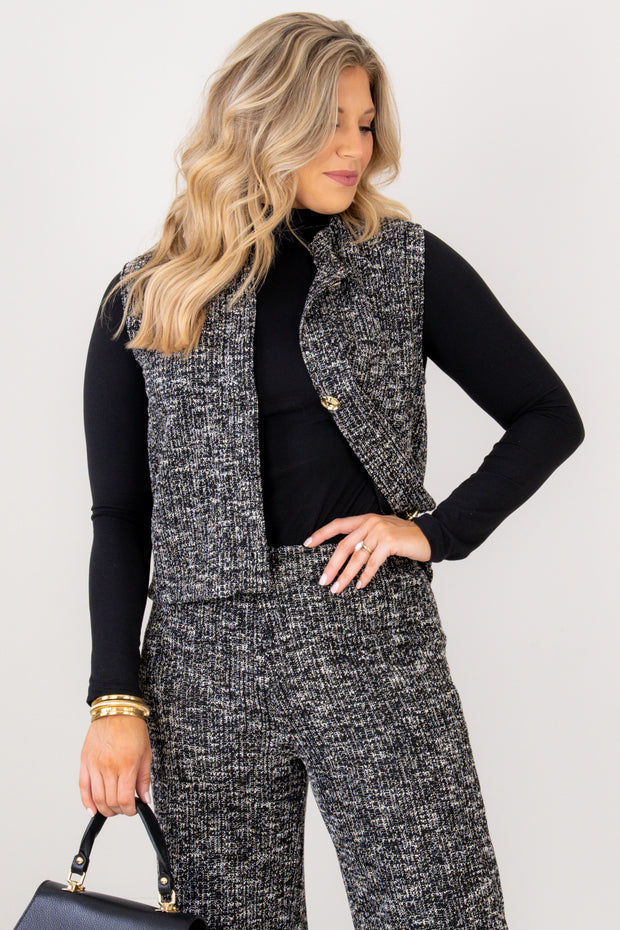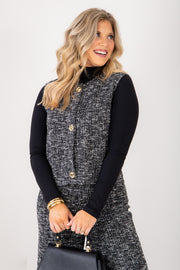 This sleeveless button-down top features a black and white tweed-like fabric with a round neckline. It is accented by three gold buttons, offering a stylish and polished look perfect for any occasion.