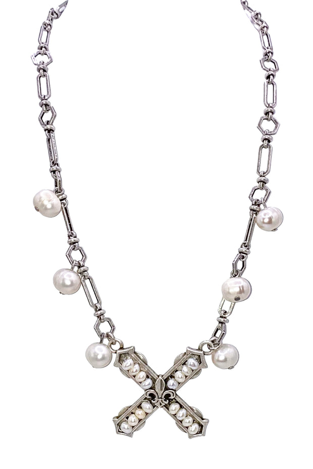 This necklace features 17” Toulouse chain with white pearl French Kiss pendant and with white Freshwater Pearl dangles. Gorgeous on its own or layered with one of our midi and long designs.
