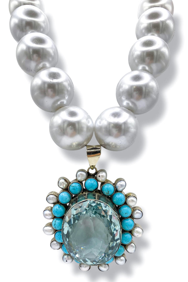 • 1970's Aquamarine, turquoise, & pearl silver Setting pendant MT Collector
