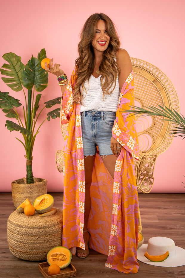 The Sienna Duster in Tribal print is a longer-length, open-front cardigan that adds a touch of elegance to any outfit. With its floral print and waist tie, it offers versatility and effortless style. Perfect for layering and completing your look with a statement piece.