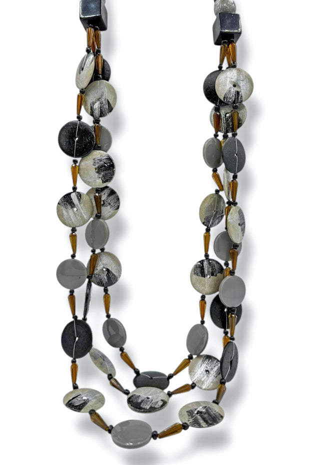 This Coco & Wood Statement Layered Necklace features a stunning multi-disk design in black. This necklace adds a touch of sophistication and elegance to any outfit. Elevate your style with this statement piece and make a lasting impression.