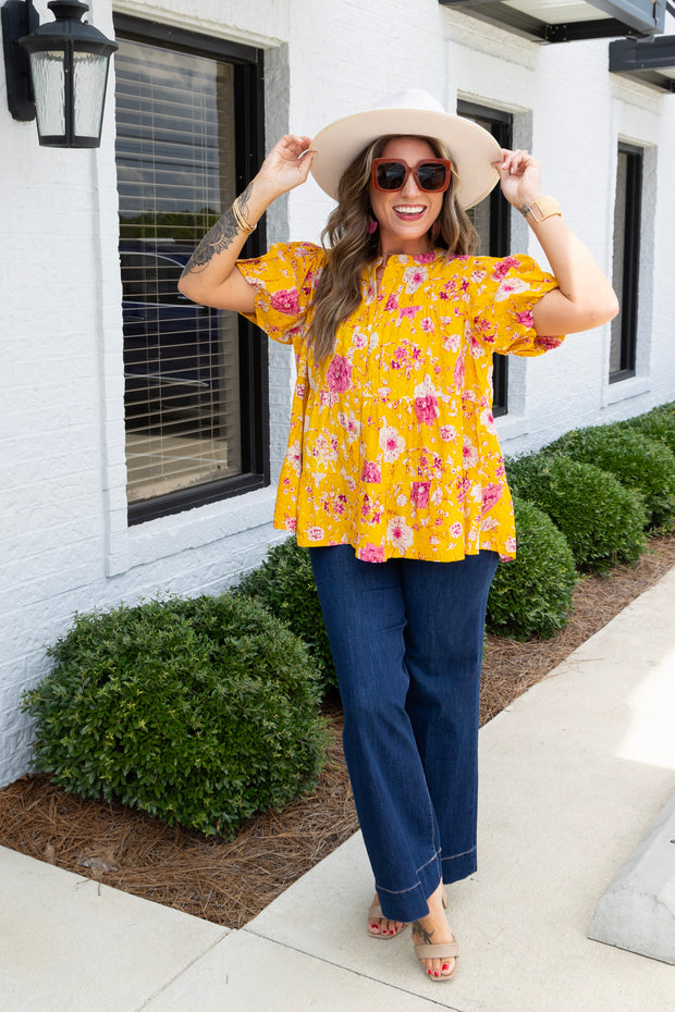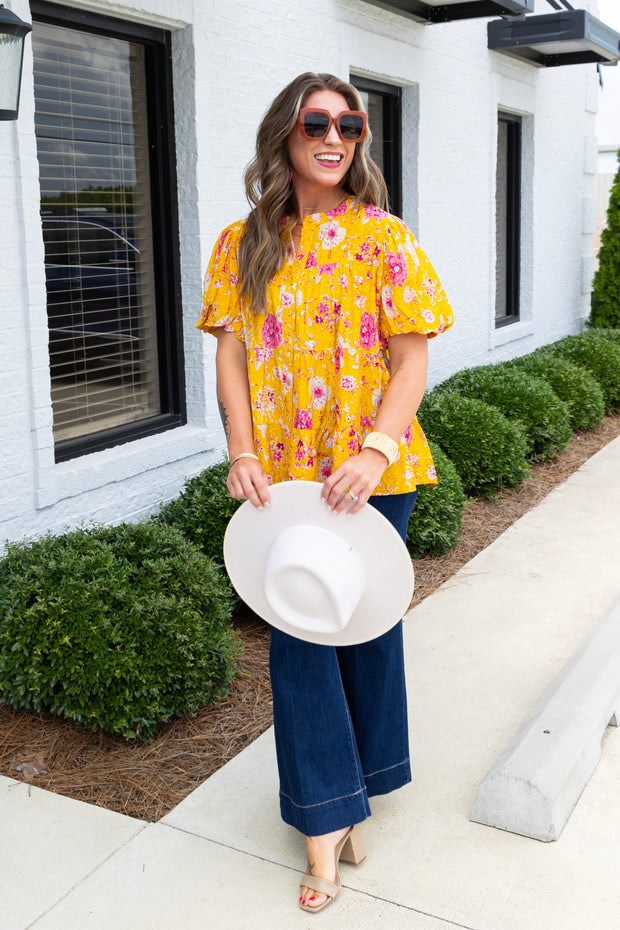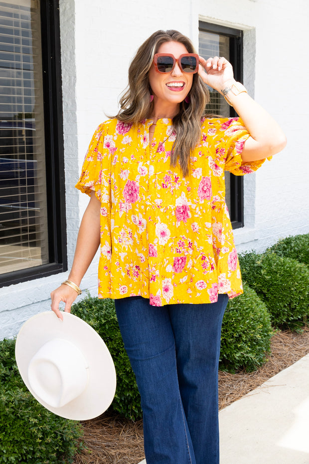 This top will have you ready to Watch Me Go! Eyelet lace details and a tiered babydoll style create a playful look, while bubble sleeves add a touch of whimsy. Button down for easy wear. (And be prepared for all the compliments!)