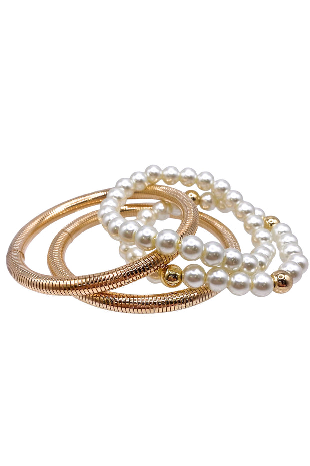 This No Better Time Bracelet Set is a must-have for any jewelry collection. Each set includes two elegant metal bracelets and two timeless pearl beaded bracelets. Perfect for any occasion, this set is versatile and stylish, adding a touch of sophistication to any outfit.