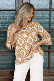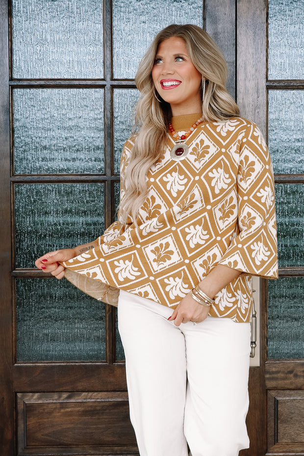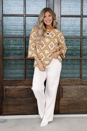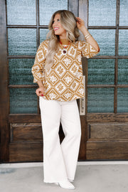 This mustard abstract print sweater features a mock neck and long sleeves, combining style and comfort. Made from soft, breathable material, it’s perfect for staying cozy while adding a pop of color to your outfit.