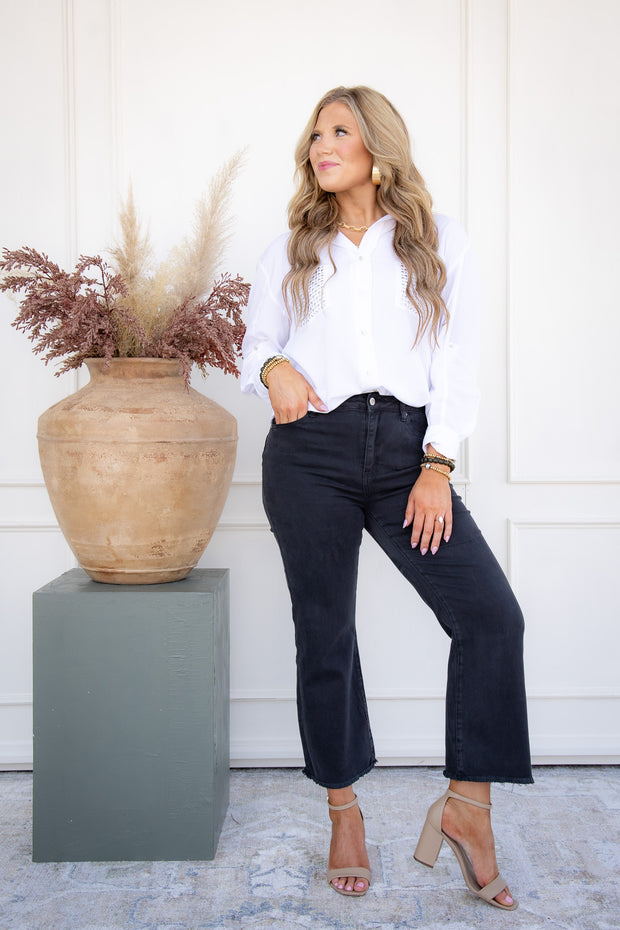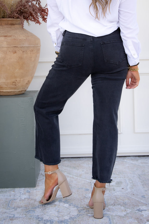 These Back In Black acid washed bootcut jeans feature a front zip button closure and raw hem line, with a versatile bootcut silhouette. Side pockets add functionality, while the acid washed material adds a trendy touch. Perfect for any casual occasion, these jeans provide both style and practicality.
