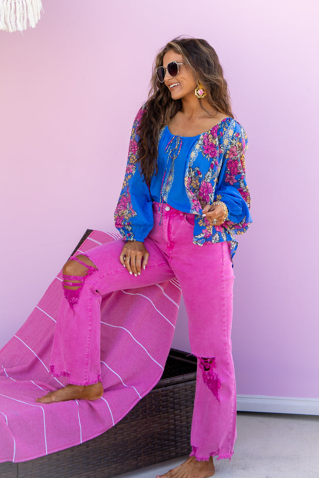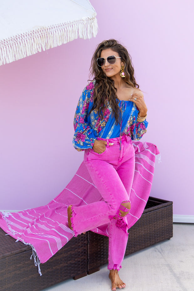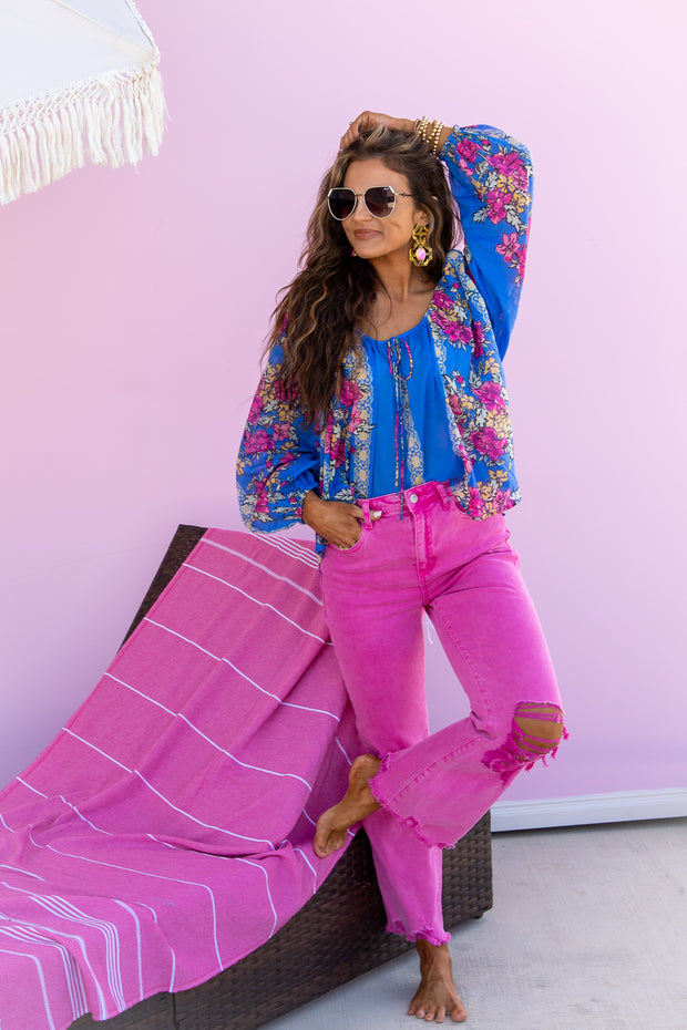 Expertly crafted for style and functionality, the On Repeat Straight Pant in Hot Pink features acid washed material, functional pockets, and a front zip button closure. The distressed knee detailing adds a touch of edginess to this versatile piece. Elevate your wardrobe with this must-have essential.