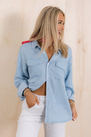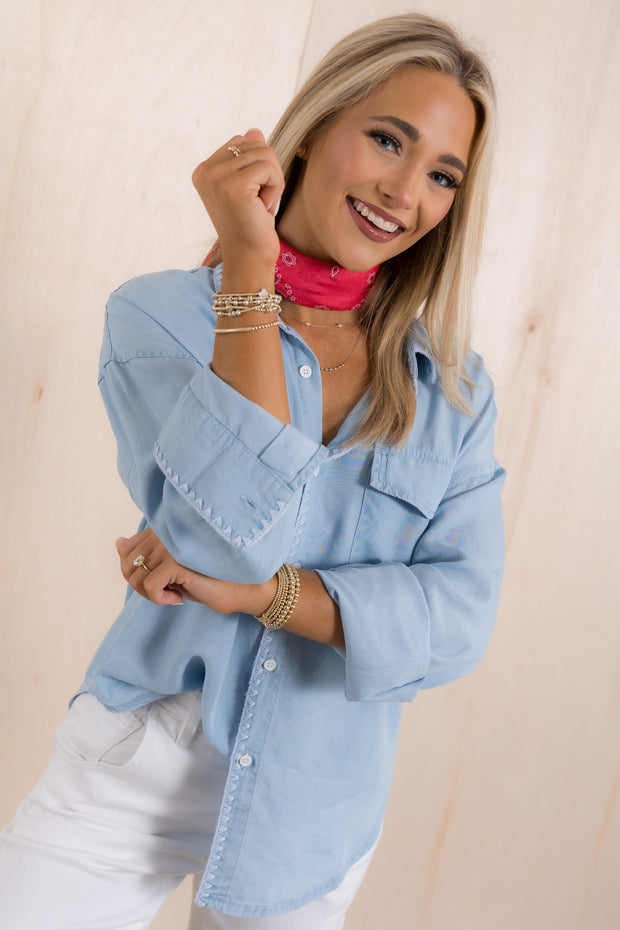 Featuring a front bust pocket, button down closure, and v neckline, this top exudes sophistication. The embroidered detailing adds a touch of elegance, making it perfect for any occasion.