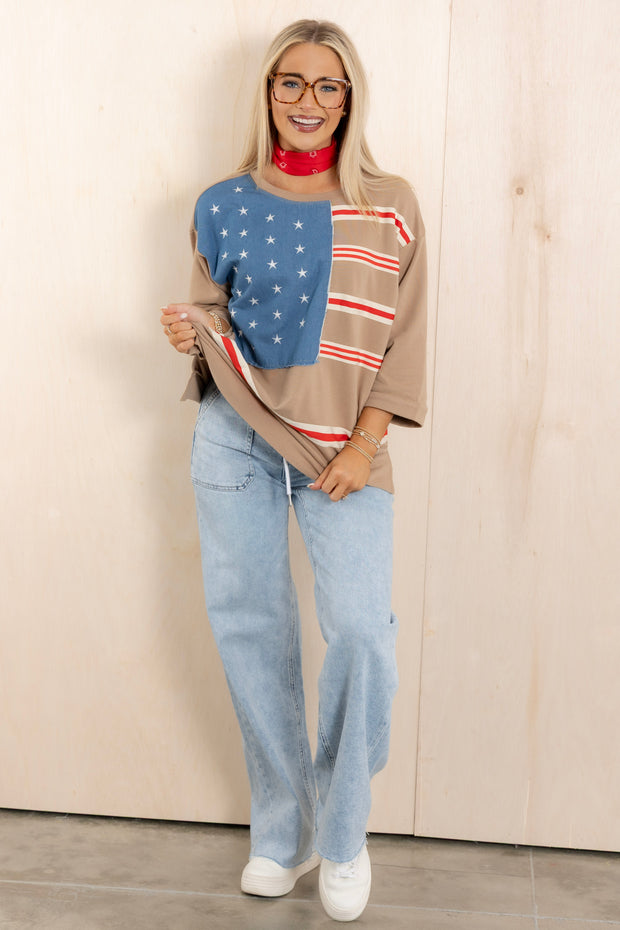This Short Sleeve Top features a rounded neckline and short sleeves, with a waist length and boxy silhouette for a comfortable and flattering fit. The subtle flag detailing adds a patriotic touch to this versatile top.