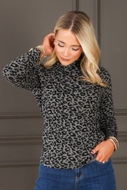This sage leopard print top features a flattering mock neckline and long sleeves, perfect for everyday wear. Its waist-length cut offers a comfortable fit that's easy to style with your favorite bottoms. A casual yet trendy choice for any wardrobe.