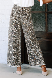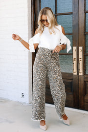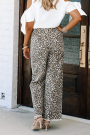 These Pants feature a high waist and a straight leg silhouette for a flattering fit. The front button closure adds a classic touch, while the leopard print brings a bold, stylish look.