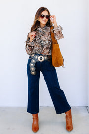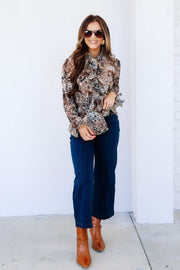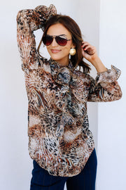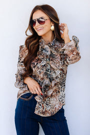 The Not Too Late Animal Print Blouse features a breathable, comfortable fabric with long sleeves and a button-down front. Its V-neckline and ruffle accents add a feminine touch to the bold animal print, making it a stylish and easy-to-wear choice for any occasion.