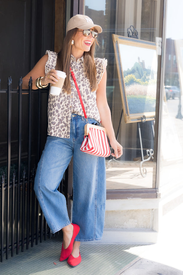Featuring a sophisticated top collar and elegant button down front, this top exudes a sense of exclusivity. Take a walk on the wild side with the fierce leopard print and embrace your fiercely feminine side with the sleeveless design.