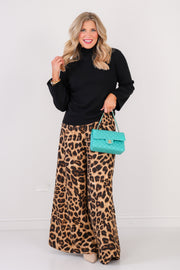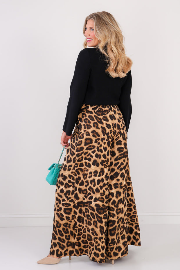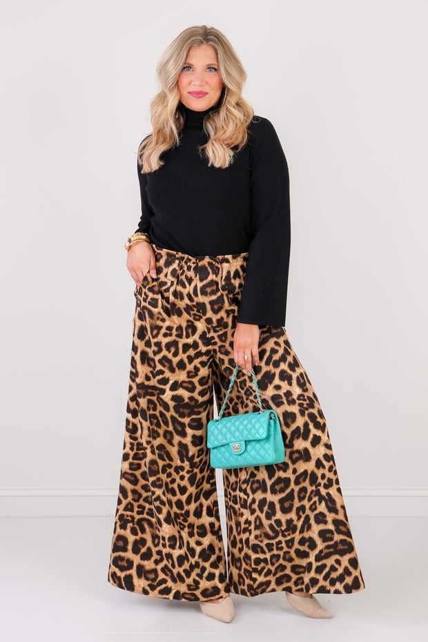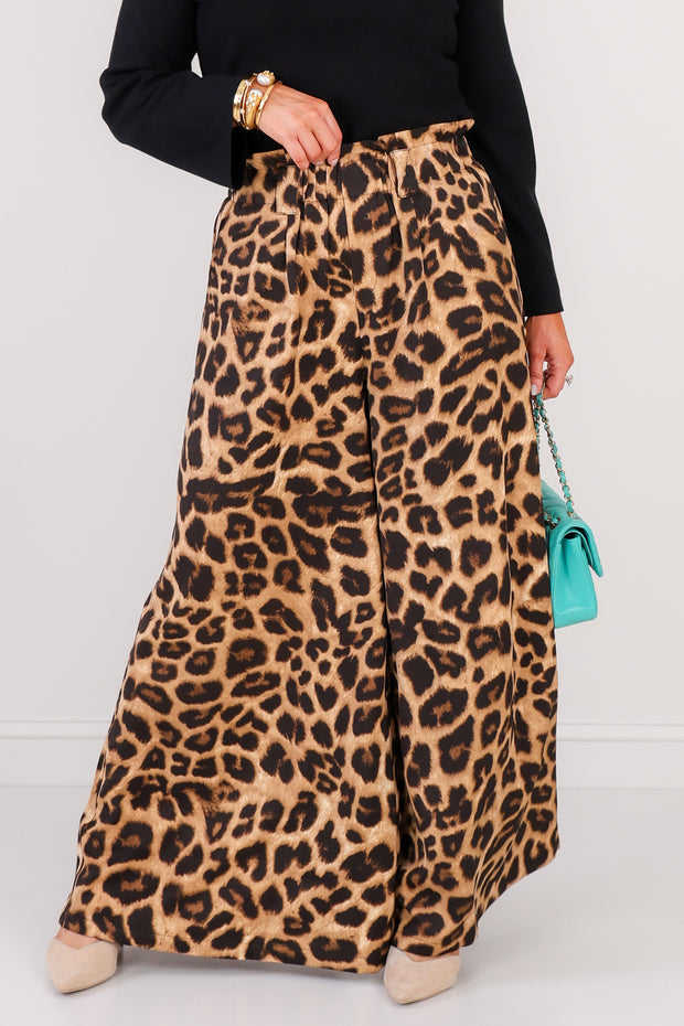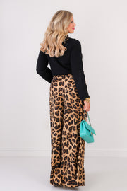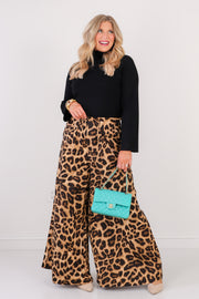 These animal print wide-leg pants feature a high-waisted elastic waistband and side pockets for convenience. Made with breathable fabric, they offer comfort and ease for everyday wear.