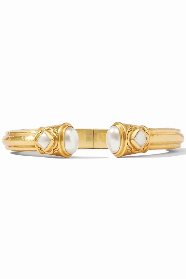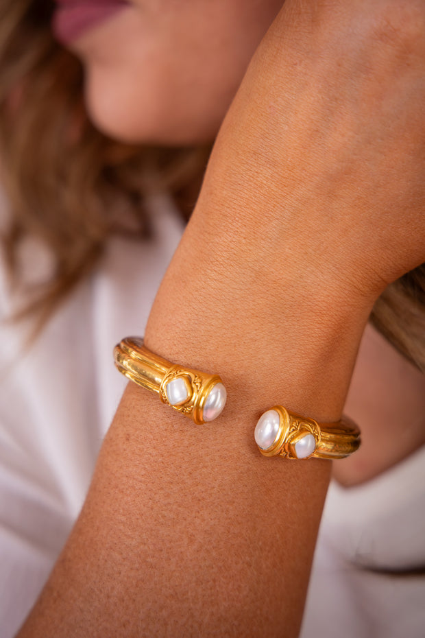 This opulent cuff features oval-shaped endcaps and diamond-shaped pearl accents and is designed with delicate piercework inside for lightness and luxury.