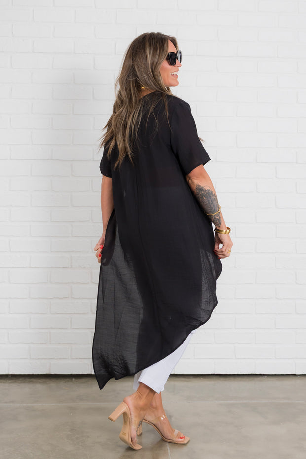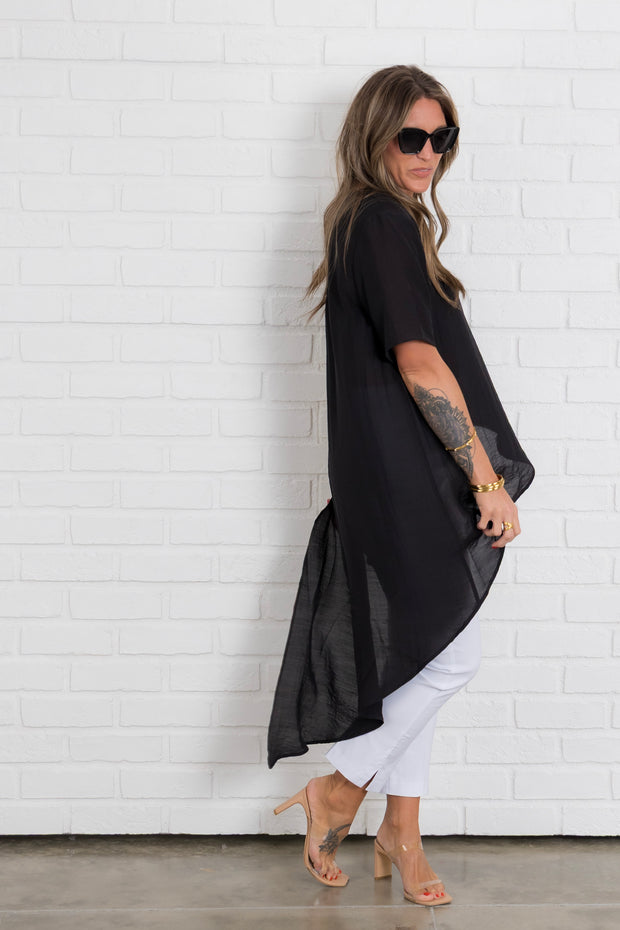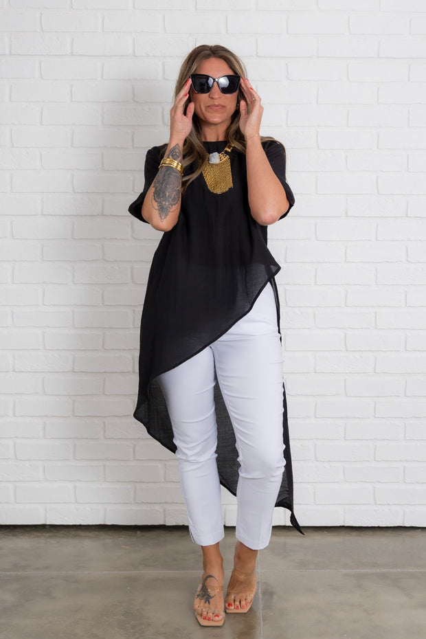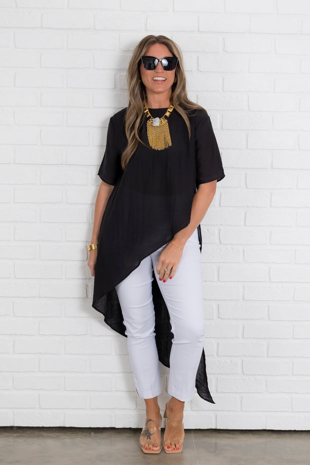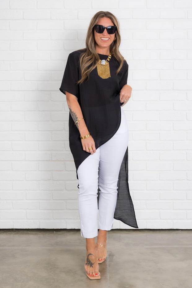 With its rounded neckline and short sleeves, this top provides a flattering fit. The longer back length adds coverage, while the shorter front length allows for easy movement.