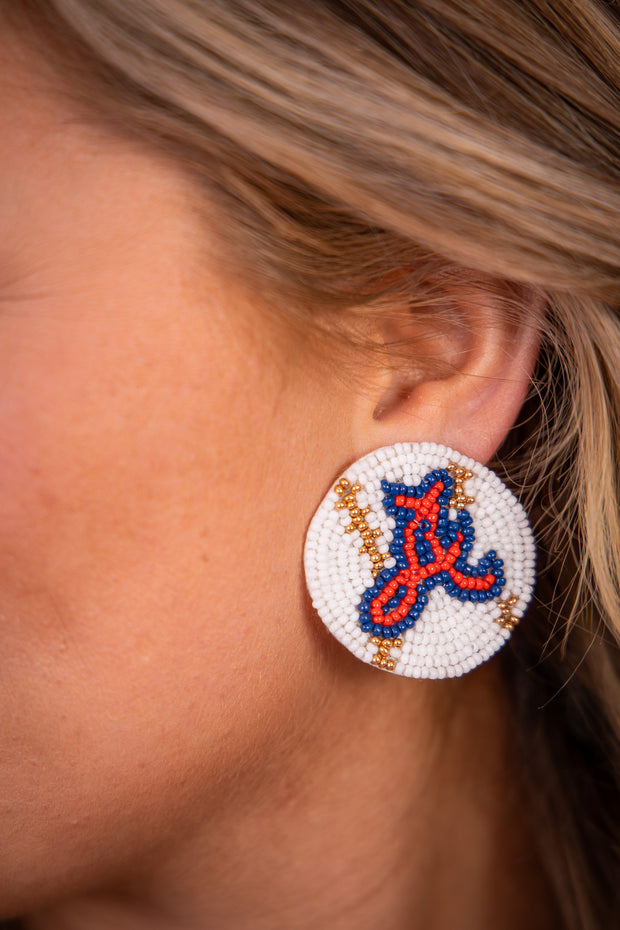 These stylish earring features a white seed beaded baseball design with navy and red "A" accents. Show your love for the game with these unique earrings. These will look perfect for all your game days!