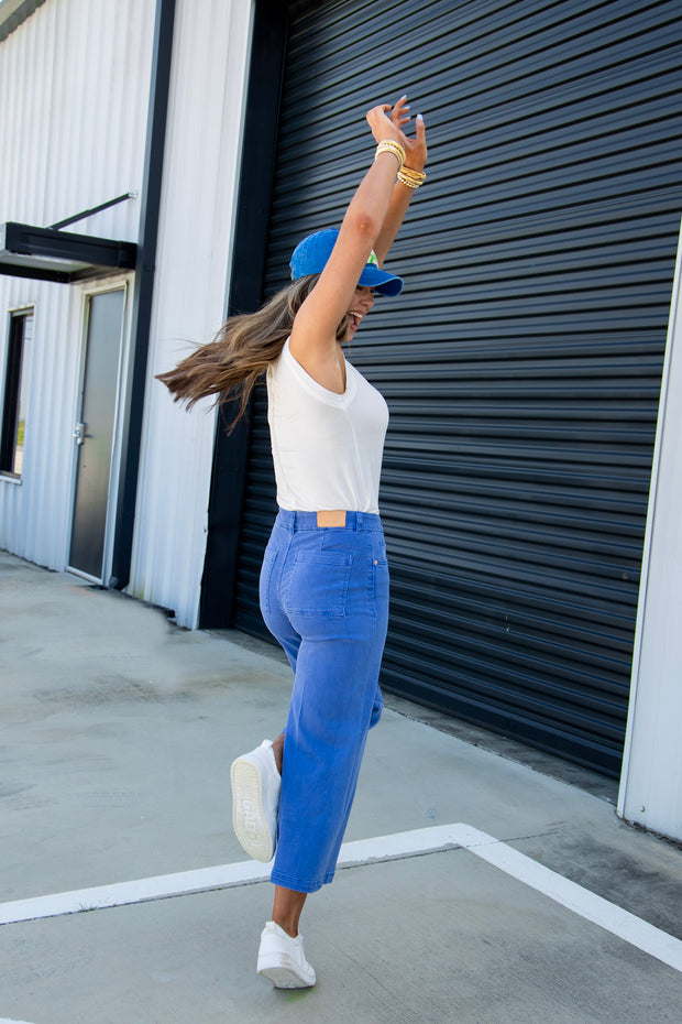 Super high rise croppd wide leg jeans. A statement-making denim wonder resting at the natural waist, offering a relaxed silhouette in the hip and thigh. Cropped inseam on stretch denim accented with back patch pockets, wide hem opening, back darts for lift support, matching button waistband closure, washed in designer color palettes & softness.