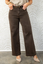 These Jeans feature a front zip and button closure for easy wear, practical side pockets, and stylish tulip detailing. The brown wash and subtle snake print detailing creates a versatile look that pairs well with many outfits.