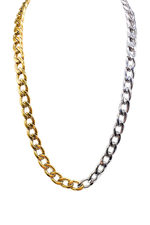 The Ava Necklace by Kristalize offers a unique design with its chain link style, featuring a striking combination of half gold and half silver plating. Elevate any outfit with this versatile and eye-catching accessory. Perfect for adding a touch of sophistication and elegance.