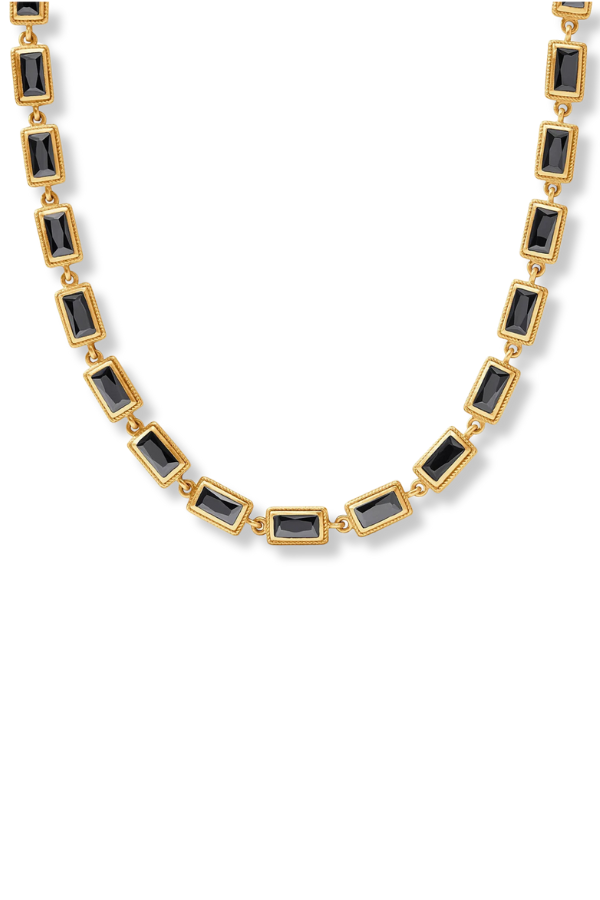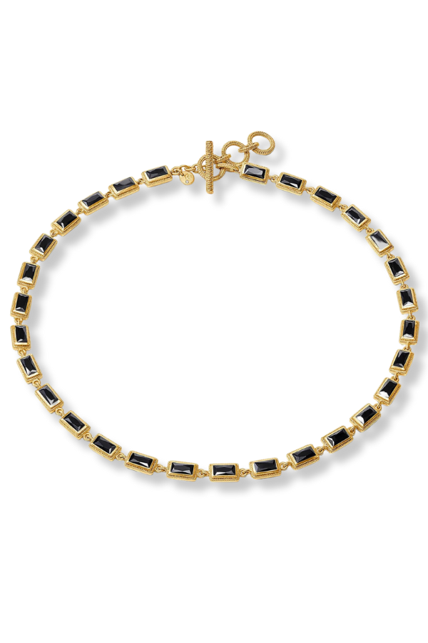 Add a touch of elegance to any outfit with the Baguette Tennis Necklace by Julie Vos. The baguette-cut gemstones are beautifully embellished with twisted golden wire, creating a unique and sophisticated piece. The necklace is secured with a matching toggle ring for a polished finish.