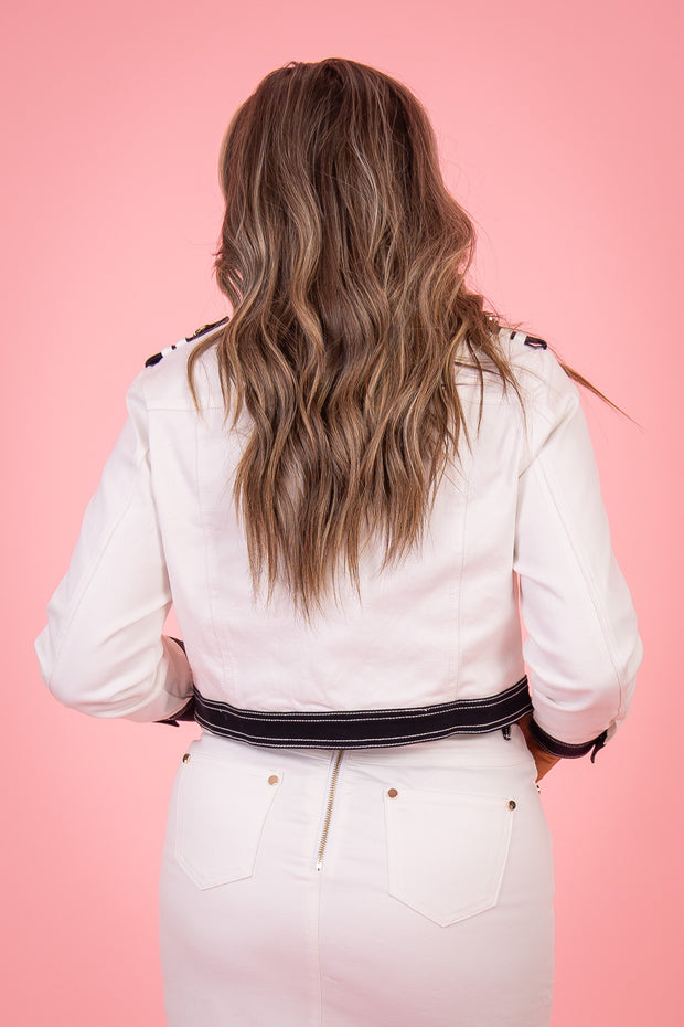 The Bali Jacket is a modern take on a classic denim jacket. Featuring a button down front, long sleeves, and a cropped silhouette, this jacket is perfect for layering. The two tone detailing adds a unique touch, making it a versatile piece for any wardrobe. Made with high-quality denim material, it provides both style and durability.