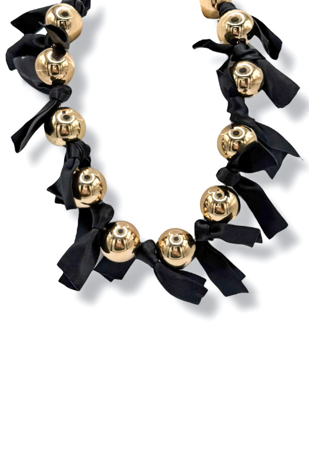 Featuring a unique blend of ball and ribbon design in classic black and gold. This necklace adds a touch of elegance and sophistication to any outfit. Elevate your style and make a statement with this versatile accessory.