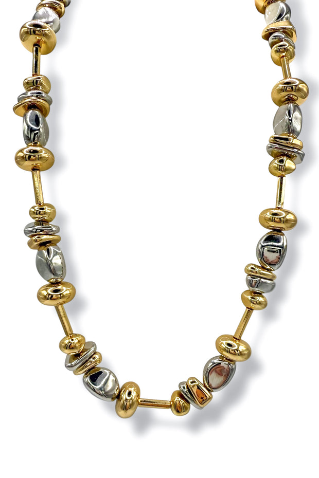 This delicate beaded necklace combines gold and silver elements for versatile styling. The alternating metallic tones create a subtle shimmer that pairs easily with both casual and dressy outfits.