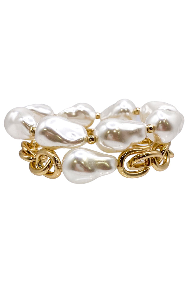 This elegant In My Dreams Bracelet Set includes a pearl bracelet with gold accents and a chain link bracelet with a pearl detail. The perfect combination of luxury and simplicity for any occasion. Enhance your style with these timeless accessories.