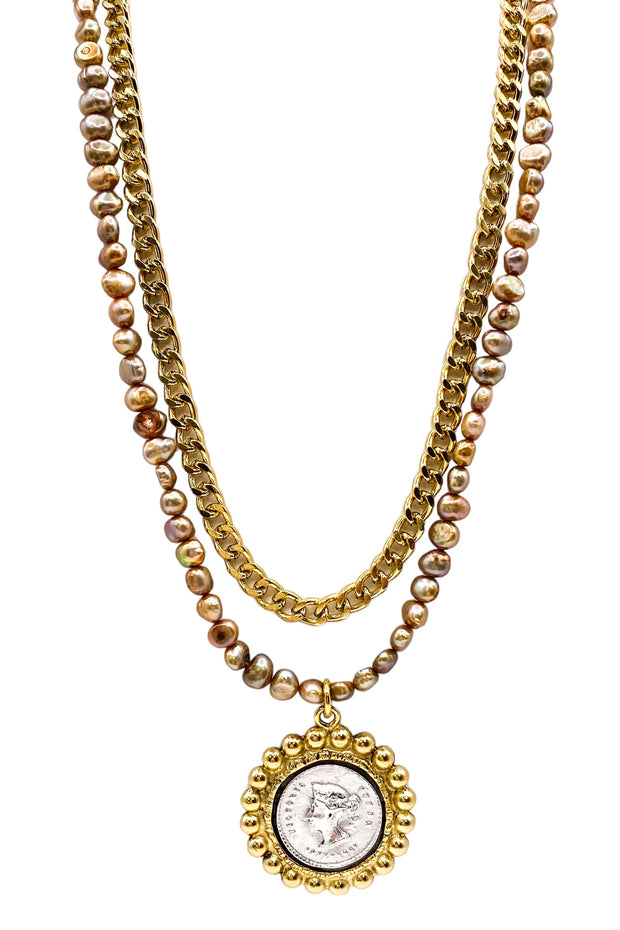 Introducing the Jordan Necklace: a stunning Baroque Pearl Necklace with a coin pendant and a Chain Necklace. Perfect for the modern woman who exudes sophistication and elegance! This exquisite piece will give you an effortless yet sophisticated look that will take your style to the next level.