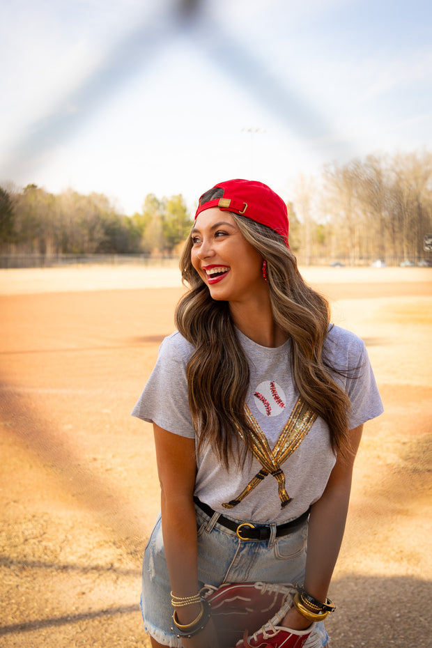 This grey baseball tee offers a unique twist with its sequin baseball and bat detailing on the front. Made with butter soft material, it features a rounded neckline and short sleeves for maximum comfort. Perfect for the queen of sparkles who loves to add a touch of glam to her casual look.