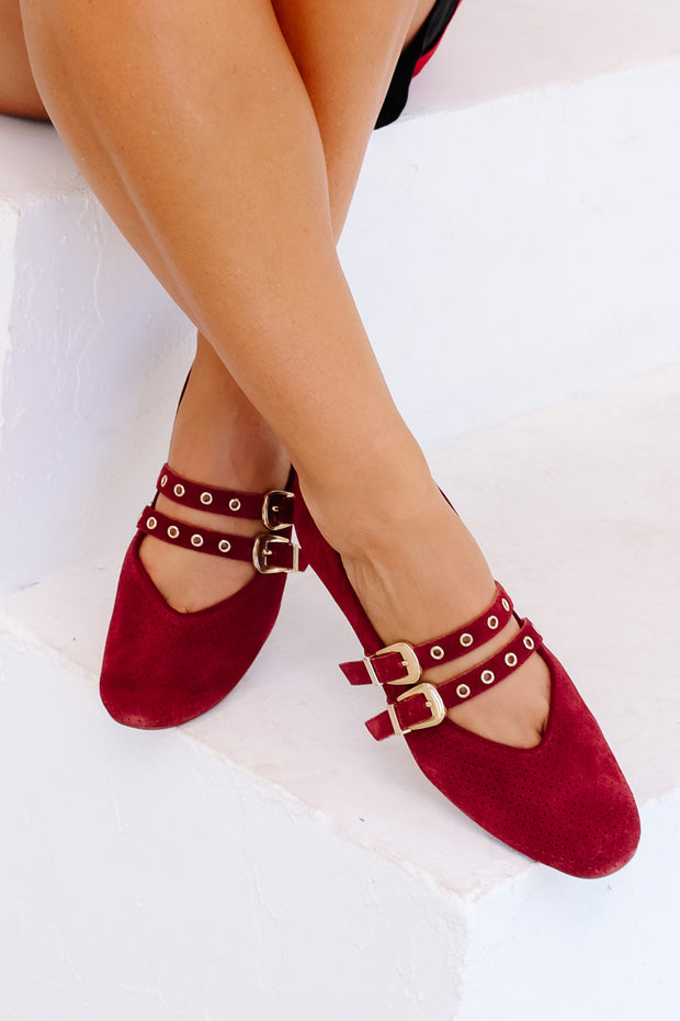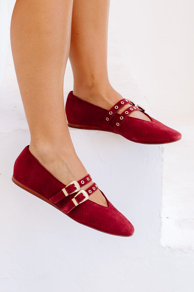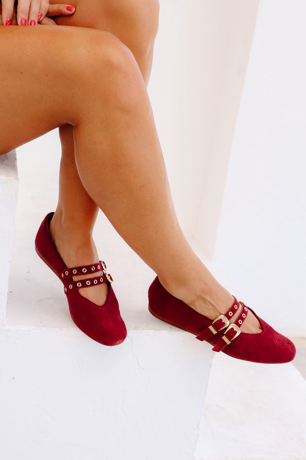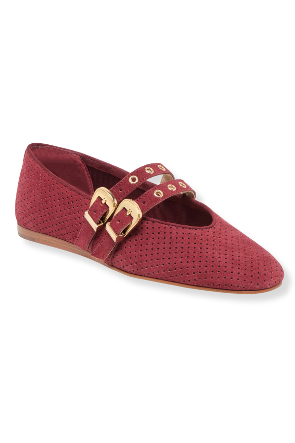 BAYLEE GROMMET makes a statement out of her double strap mary-jane design with gold metal grommets and bold buckles. This sustainably-crafted flat boasts sustainable materials and a bevy of colorways in perforated or printed suede for one on-trend and versatile ballet flat.