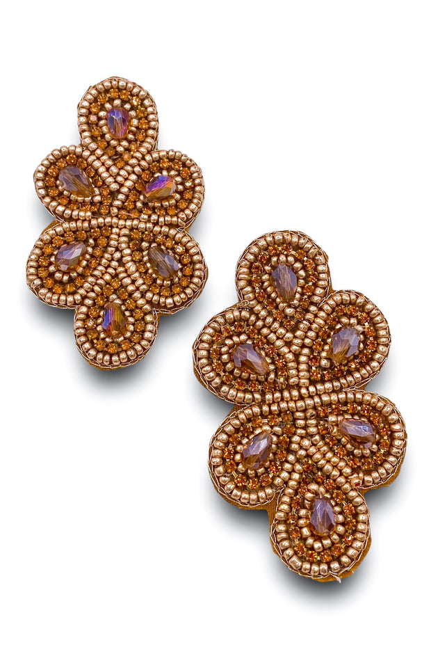 This Linda Earring features an intricate beaded design with gold detailing and colored beads. Perfect for making a statement, the earring is sure to become a staple in your wardrobe.