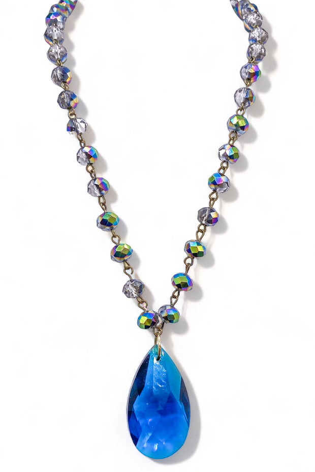 Introducing the Mandy Pendant Necklace in blue. This beaded necklace features a beautifully faceted blue pendant, adding a touch of elegance to any outfit. Elevate your style with this eye-catching accessory.